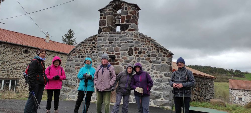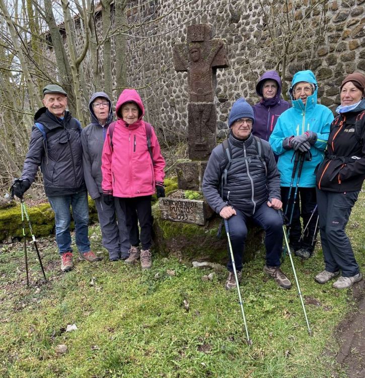 Nous sommes partis sous un beau ciel de nuages gris chargés d'humidité poussés par un puissant vent du nord bien froid. Les  photos à Cros Pouget, avec les 8 participants, témoignent de cette "douce journée de printemps" !