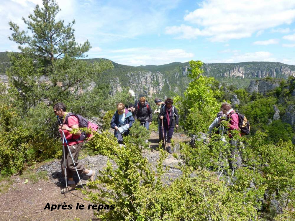 Nos pas nous conduisent par un superbe sentier le long de la Jonte qui monte ensuite tranquillement jusqu'à l'Ermitage St Michel : site tout à fait remarquable ; dans sa petite chapelle, les ermites pouvaient méditer et contempler à loisir et rendre grâce pour une si magnifique création qui s'offre de toutes parts. Un petit tour dans le cirque de Madasse avant de reprendre le sentier de la corniche du Causse Noir avec ses points de vue impressionnants sur des abimes sans fond, des falaises  vertigineuses et la vue magnifique sur tout le secteur que nous avons parcouru hier. Passant sous le Point Sublime, nous arrivons au Champignon préhistorique où nous rattrapent 3 vététistes... Mais comment font-ils pour passer dans ces sentiers totalement impraticables aux vélos ? Et le portage, alors, entre les courts épisodes de roulage, ça existe ! Et du pylône qui domine Le Rozier et Peyreleau nous n'avons plus qu'à descendre par un sentier particulièrement escarpé les 420 mètres qui nous séparent de notre point de départ.